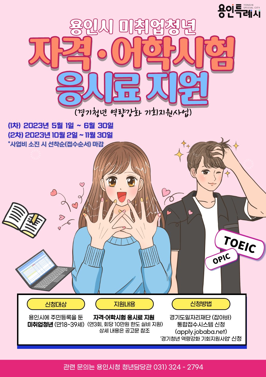 용인특례시는 미취업 청년들의 취업비용 부담을 줄이기 위해 어학시험, 국가기술자격시험, 국가공인 민간자격증 등 659종의 시험 응시료를 지원하고 있습니다. 1차 접수는 지난 6월 30일에 종료됐고, 10월에 시작되는 2차 접수 일정을 확인하셔서 비용 지원도 받고, 꼭 취업에 성공하시길 바랍니다.